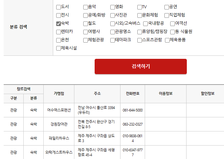 교통 항목으로 렌터카, 항공 업체나 고속버스, 철도와도 가맹이 되어 있습니다. 철도의 경우에는 승차권 구입은 물론이고 KTX 및 일반열차(ITX-새마을, 새마을호, 무궁화호, 누리로)를 횟수와 구간에 관계없이 2일 또는 3일간 자유롭게 자유석 및 입석으로 탑승할 수 있는 문화누리레일패스를 구입할 수 있습니다. 일부 숙박업소에서도 사용할 수 있습니다. 문화누리카드 홈페이지에서 검색해 보면 이용할 수 있는 숙박업소 목록이 나옵니다.