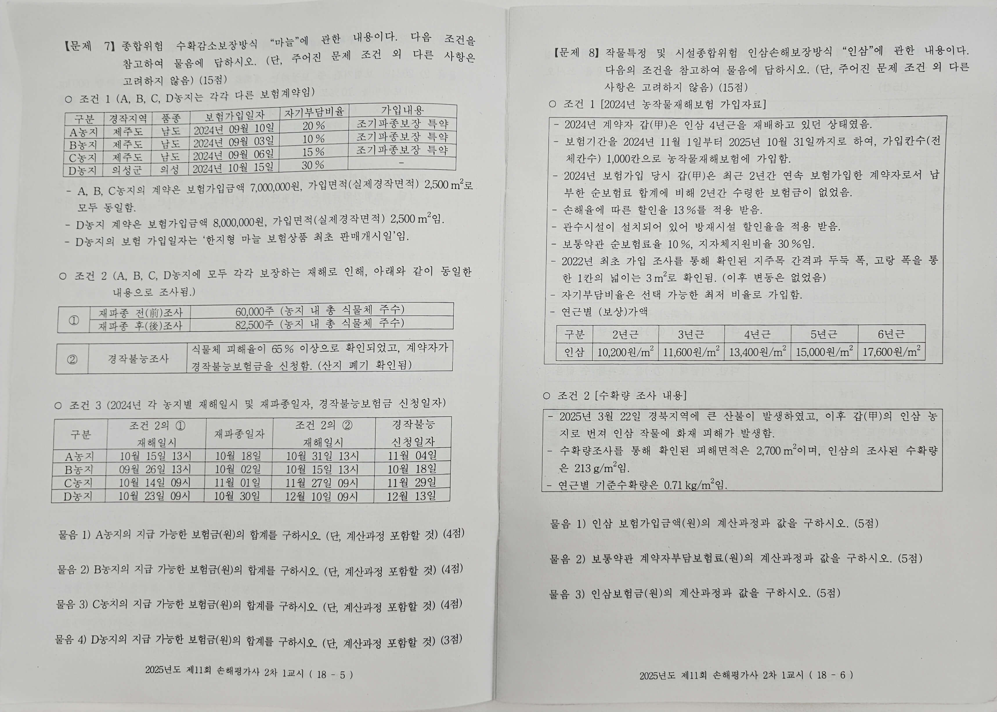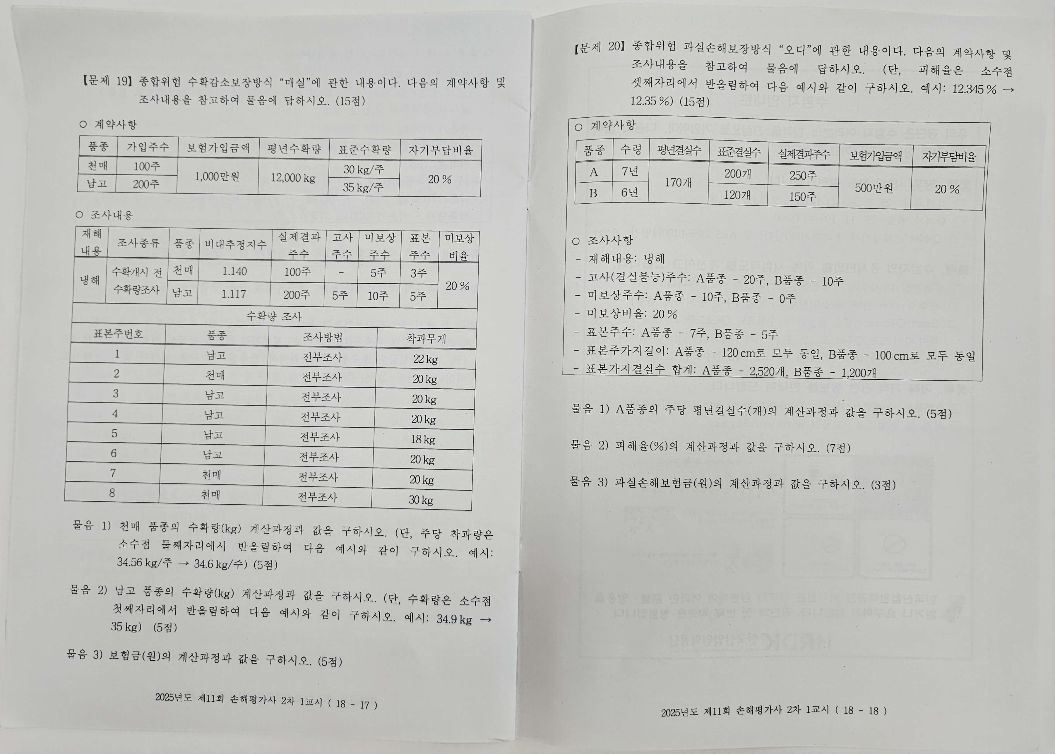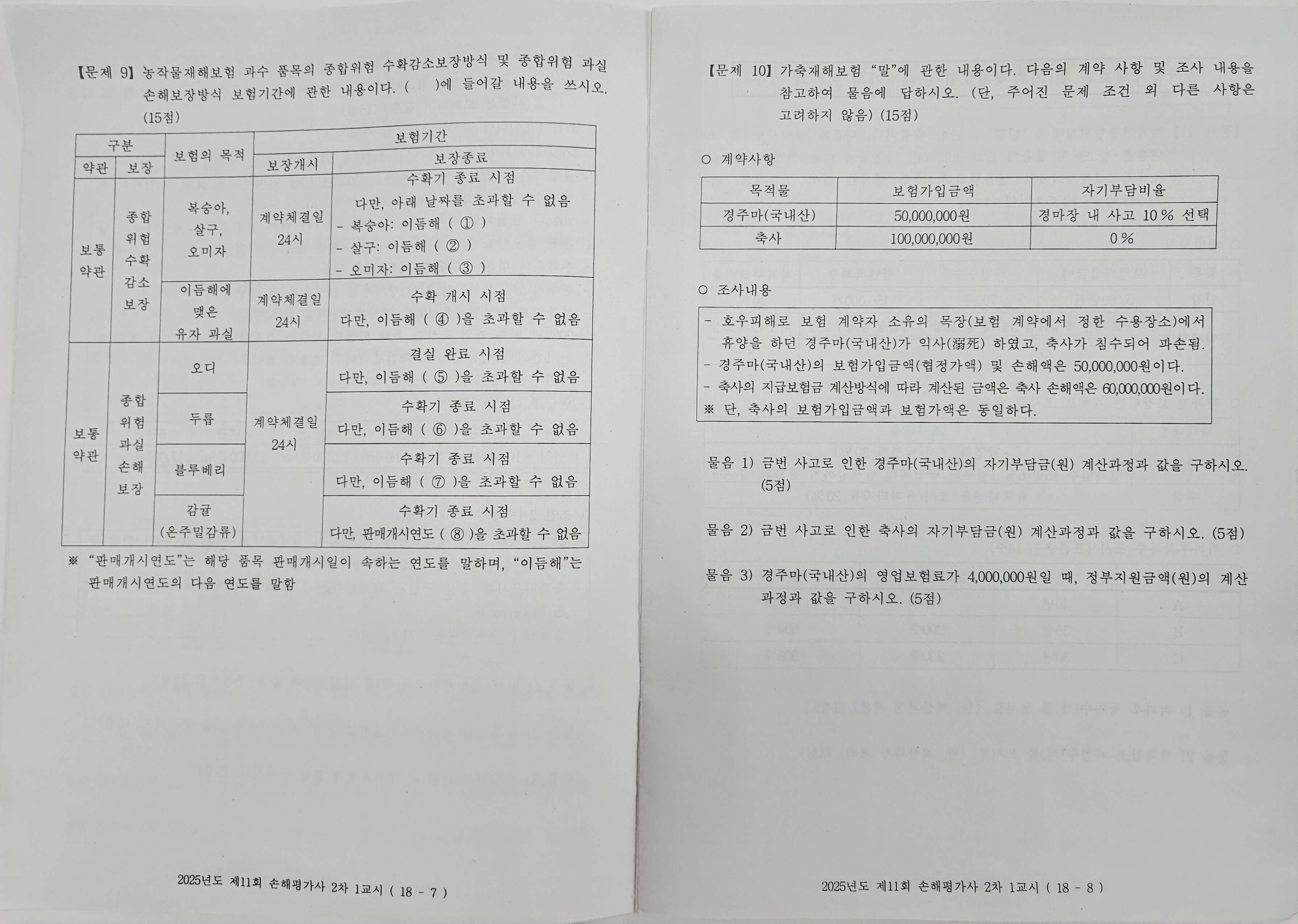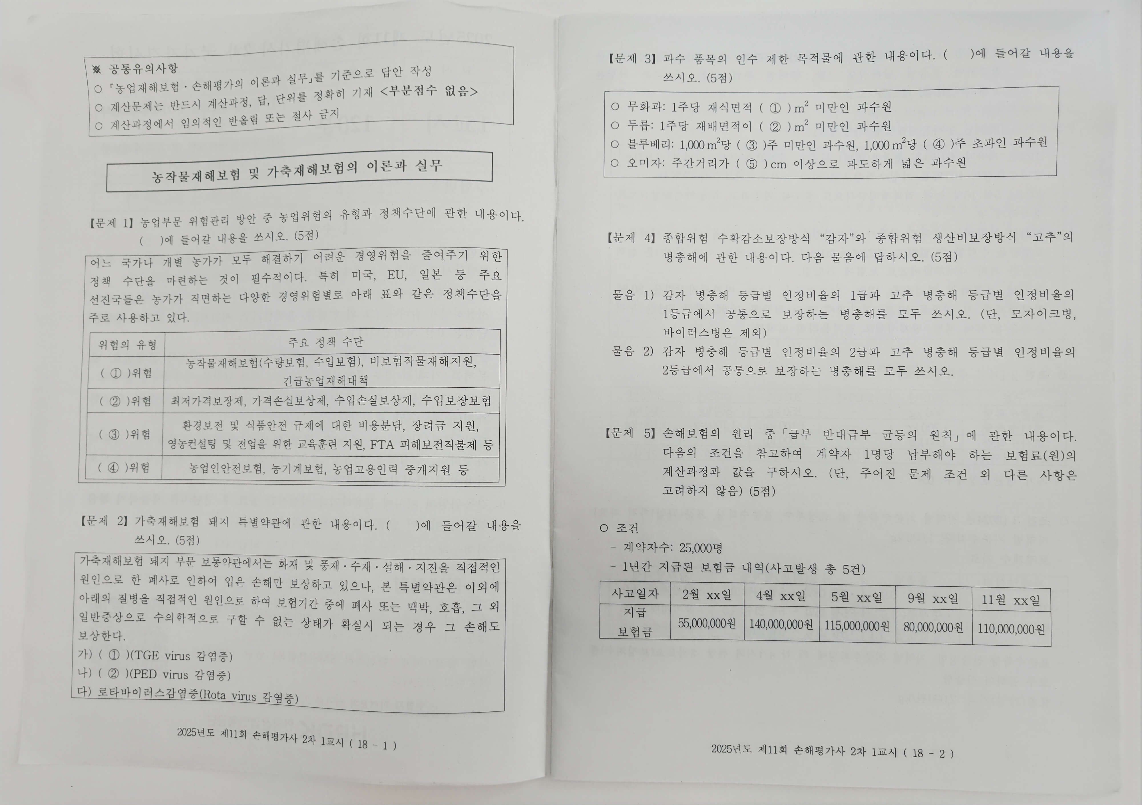 2차 손해평가사 시험은 총 120분에 20문제를 푸는 것입니다. 과목은 두 과목으로 '농작물재해보험 및 가축재해보험의 이론과 실무', '농작물재해보험 및 가축재해보험 손해평가의 이론과 실무'입니다. 두 과목 모두 1~5번 문제는 각 5점씩으로 비교적 암기 위주로 이루어진 단답식 문제들입니다.