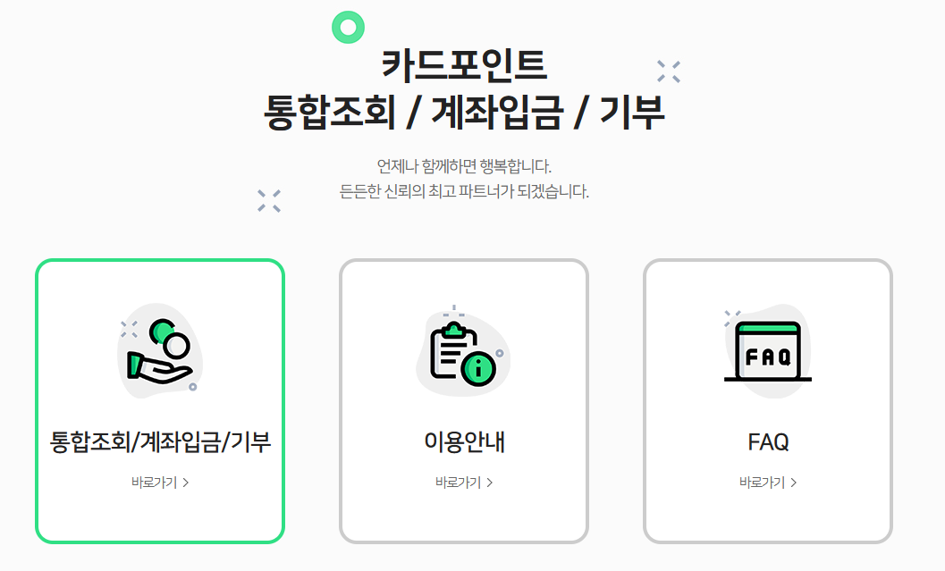 카드 포인트 통합조회로 포인트 적립 내역을 볼 수 있고, 카드 포인트 계좌입금을 클릭하여 입금 계좌를 입력하는 절차를 거치게 됩니다.