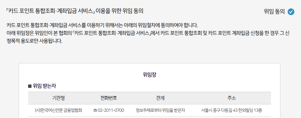 본인 확인 서비스에서 휴대폰 인증을 선택합니다. 여기서 휴대폰으로 본인 인증을 해준다면 위임 관련 내용이 나옵니다. 「카드 포인트 통합조회·계좌입금 서비스」 이용을 위한 위임 동의입니다. 위임 동의를 클릭하고 다음을 눌러주세요. 그러면 카드 포인트 통합조회로 본인이 갖고 있는 신용카드의 적립금 내역을 볼 수 있습니다.