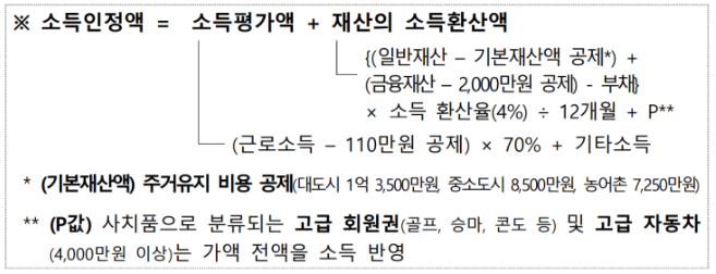 - 소득인정액 기준 하위 70%라는 조건은 매년 소득 및 재산 수준과 생활실태, 물가상승률 등을 고려해 산정함