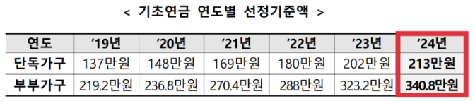 위의 표를 통해 알 수 있듯이 올해 기초연금 선정기준액은 단독가구는 213만 원, 부부가구는 340만 8천 원임을 알 수 있습니다. 다시 말해, 월 소득이 위의 표를 기준으로 이하라면 기초연금을 받을 수 있는 대상자라는 뜻입니다.